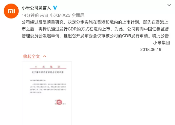 6月19日消息 即时消息:小米公司在官方微博上发布了一封文件,内容显示,公司决定分步实施在香港和境内的上市计划,即先在香港上市之后,再择机通过发行CDR的方式在境内上市。为此,小米集团将向中国证券监督管理委员会发起申请,推迟召开发审委会议审核公司的CDR发行申请。