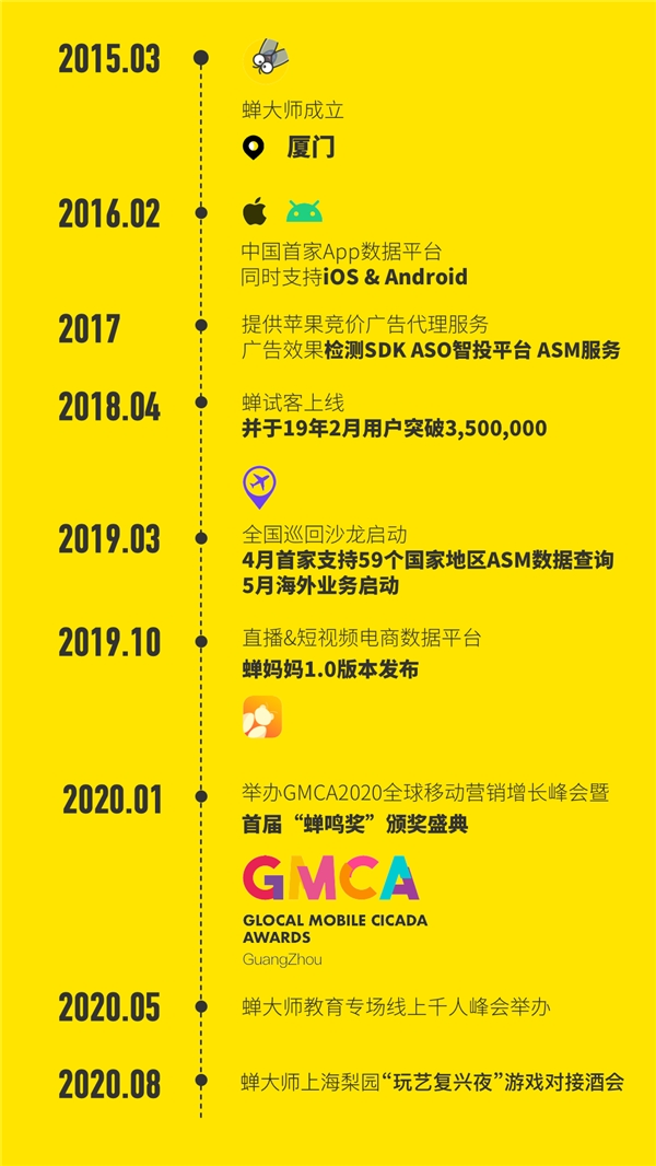 2020年,App大数据与应用全球推广专家——蝉大师迎来了5周年庆典。自2015年成立以来,蝉大师始终深耕于大数据服务,致力为用户提供快速精准的数据分析和优质的推广服务,助力企业以数据驱动增长实现更高的商业价值。