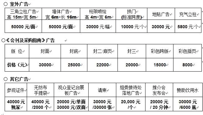 ● 品牌展位:(长×宽×高:6m×3m×4.5m):¥30,000 / 18㎡(含钢制桁架搭建、喷绘、地毯、洽谈桌椅及照明等)