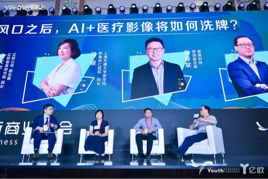 (从左到右:亿欧公司副总裁兼亿欧智库研究院院长由天宇、上海同仁医院院长马骏、推想科技营销副总裁张春棠、道彤投资创始管理合伙人孙琦)
