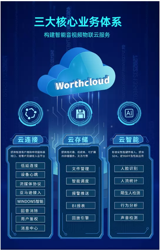 值得看自主研发架构的Worthcloud AIoT云开放平台,面向商业智能、智能家居、智慧社区、智慧园区及智能安防等行业,提供端到端的音视频连接方案和服务。截至目前,Worthcloud云平台承载宽带和窄带两大IT设备,通过接入现有云服务能力,可最大限度降低硬件开发技术门槛及研发成本。