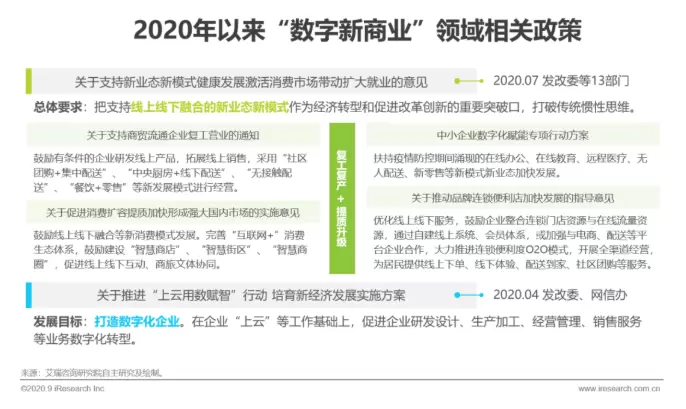 自2015年国务院出台《关于大力发展电子商务加快培育经济新动力的意见》以来,线上线下融合一直是培育壮大新型消费、促进商业企业转型升级的主旋律,全面覆盖零售、餐饮以及教育、医疗健康、家政、美业、文旅、体育等各类本地生活场景。疫情期间融合模式因被视为应对危机、加快企业复工复产的关键手段,相关政策密集出台。面向中小微企业国家倡导“上云用数赋智”,能力扶持、金融普惠、搭建生态等一系列落地举措将有效支撑商业企业依托云服务开展数字化转型。