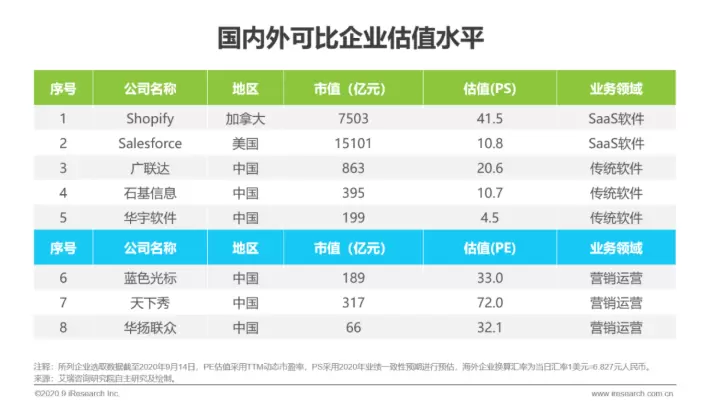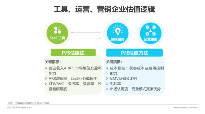 “数字新商业”转型背景下的厂商中,厂商的收入主要来自于SaaS工具收入和运营、营销等服务类收入,对于产品和服务两种业务通常采取不同的估值方式,产品类厂商和业务通常采取P/S估值方法,而服务类企业采取P/E估值方法。在关注数字新商业的厂商投资价值时,针对SaaS工具类更多的关注产品收入及增长、续费率和续约率等指标,而服务类厂商更多需要关注GMV和毛利率等盈利能力。对标国外厂商,SaaS工具类企业估值千亿以上,国内对标上市公司广联达等软件厂商企业市值也在800亿以上。营销运营类企业整体估值较低,但随着数字新商业拥抱产业的进程不断深入,佣金收入仍会为企业带来新的增长。而具备工具、运营、营销类业务的企业收入来源较多,业务协同性高,更具成长价值。