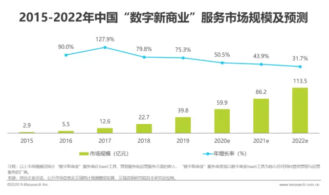 2020年,在宏观经济回落和市场整体需求不振的大环境下, “数字新商业”服务预计仍能取得超过50%的增长。一方面,线下商家在疫情的影响下搭建线上渠道的意愿增强,随着新商家的不断拓展,“数字新商业”服务商的GMV增长迅速;另一方面,小程序的新功能开发和直播电商的活跃,加速了整个“数字新商业”的进程。根据艾瑞咨询预测,到2022年中国“数字新商业”服务规模将达到113.5亿元。