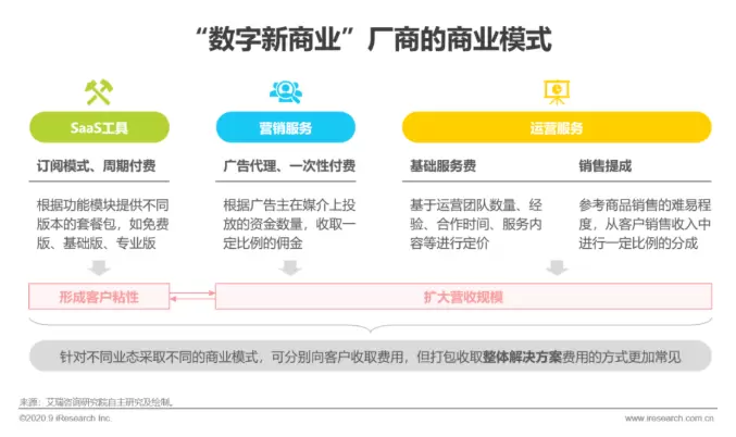 “数字新商业”厂商涉及的服务业态同时包括SaaS工具、营销和运营服务三大类,针对不同的服务业态遵循各自业态的收费模式,即SaaS工具采取订阅付费模式,营销服务采用代理费制,运营服务结合基础服务费与销售提成进行收费。