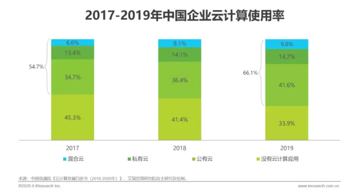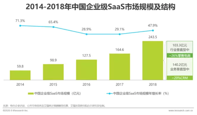 中国信通院云计算使用率调查显示,中国企业对云计算应用的接受程度逐年提高,2019年企业应用云计算的比例已经达到66.1%,其中公有云的使用率增长最快,较2017年上涨近7%。中国企业级SaaS服务中CRM和零售电商的市场规模分别领跑业务垂直型和行业垂直型SaaS,在与终端消费者息息相关的商业领域,SaaS模式正凭借降本增效、付费灵活、快速迭代等优势大展拳脚。