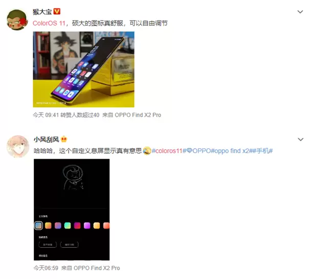 「个性化定制强大」应该是不少数码博主上手后对 ColorOS 11 的第一印象。 譬如知名微博大 V@猴大宝 就表示,「ColorOS 11 的图标可以自由调节大小,看着可真舒服」,而另外一位微博用户@小风刮风 则对新系统的息屏显示赞不绝口,盛赞其「自定义息屏显示非常有意思」。