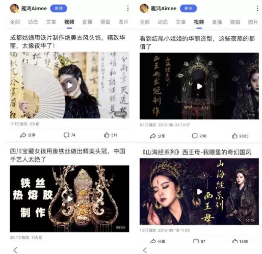 国风手工艺人雁鸿Aimee是百度平台上十分有代表性的古风手艺人。凭借自己精巧的手工技术,雁鸿Aimee还原热门古装剧里的精美头饰,并将制作过程视频上传到自己的百度主页,收获了众多粉丝关注。