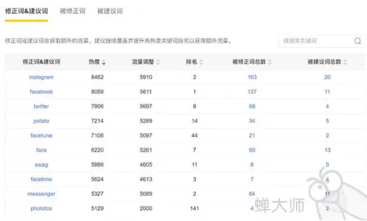 蝉大师建议提升应用覆盖的修正词和建议词排名以获取额外流量,去掉大部分被修正词的覆盖(品牌词除外),以及低热度被建议词的覆盖,把关键词空间留给其它更有价值的词,从关键词热度排名或者关键词搜索结果,筛选出有额外搜索流量的关键词,添加到应用的关键词设置里。