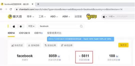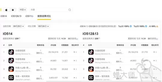 根据蝉大师大数据分析,热度5000以上的关键词中,97.26%的关键词结果数在iOS13/14上完全一致,仅有2.74%的关键词结果在iOS13/14不一样。如果蝉大师提示搜索结果相似度不是100%,那么可以切换到"搜索结果对比"页面中直接查看不同版本搜索结果的差异。