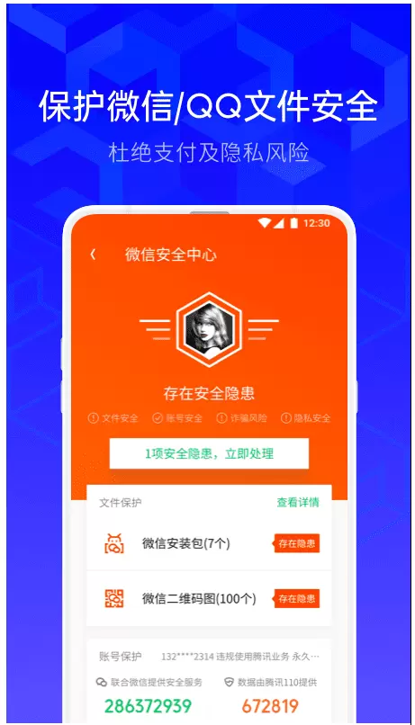 为了进一步保障用户微信、QQ沟通过程中文件传输安全,腾讯手机管家应用安全中心新增文件安全保护能力,可对用户社交平台风险安装包、二维码图片等进行实时检测,提示风险隐患,保护用户社交平台支付和隐私安全。