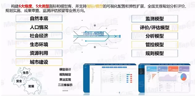 围绕国土安全、生态保护、资源利用、人居环境等维度,结合生态、安全、发展等因素,建立6大维度指标体系,5大类型模型库,同时支持指标/模型的可视化配置和弹性扩展,全面支撑业务质变,构建指标传导机制、完善全业务模型体系。