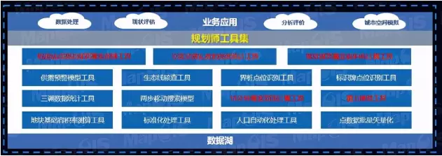 构建了15类专业规划工具,以工具为抓手,为规划师赋能,大大提高城市规划师在人口测算、轨道交通规划、区域选址、大数据处理、城市空间模拟等方面的工作效率、降低人工成本。整个工具集以数据湖为基础,通过各类工具支持上层规划专业应用,如数据处理、现状评估、分析评价、城市空间模拟等。
