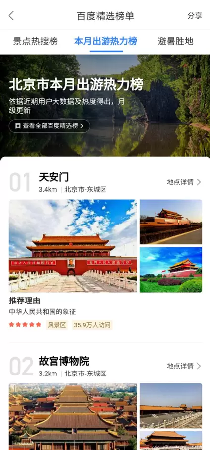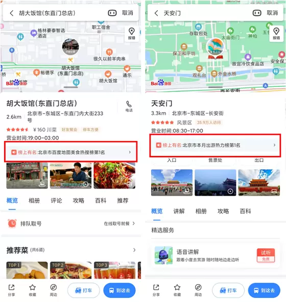如何查找百度地图“本月出游热力榜”?用户只需在百度地图中搜索“热搜榜”或直接说出“小度小度,热搜榜”,即可查看本市精选榜单。榜单中,每一个景区或餐厅的推荐理由、特色标签、人均花费、距离、菜品及环境都一一写明。不仅如此,若用户直接搜一家餐厅或景区时,不仅能看到这里是否“榜上有名”,还能看到具体入榜排名信息。从百度地图“本月出游热力榜”中可以看出,北京市9月美食热搜榜第一名的是北京市胡大饭馆(东直门总店),而出游热力榜第一名则是天安门。十一出游前用百度地图提前种草人气好去处,即使是初次到访的城市,也可以感受“跟着榜单出游如此简单”的便利感。