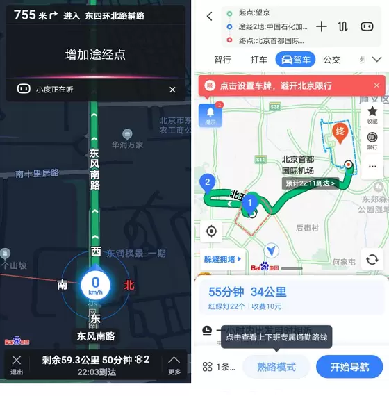 在驾车场景中,当用户想要改变行程终点或是增加新的途经点时,手动输入不仅费时还十分危险。而通过百度地图智能语音助手,用户只需呼叫“小度小度,先去北京西站,然后去大兴机场”或“切换目的地到大兴机场”,即可完成指令输入,减少手动触控而出现的行驶风险。