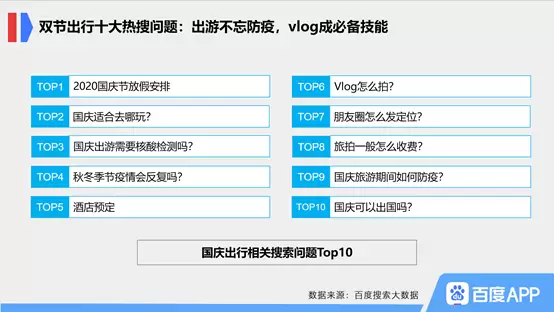 面对世界范围内疫情反复的局面,中国网民则表现出理性的安全出游意识。如何在假期出行时科学防疫,成为网友关注焦点。百度搜索大数据显示,“国庆出游需要核酸检测吗?”、“秋冬季节疫情会反复吗?”、“国庆旅游期间如何防疫?”成为网友关注的国庆出游十大问题之一。