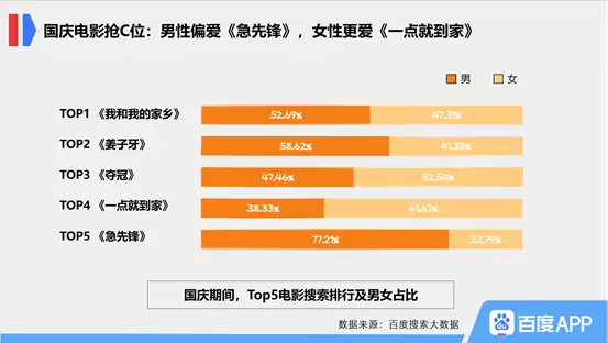 其中,票房超17亿的《我和我的家乡》最受期待;《姜子牙》、《夺冠》等优秀作品纷纷上榜。数据显示,男性网友普遍关注《急先锋》热情更高,女性网友则更愿意搜索《一点就到家》。