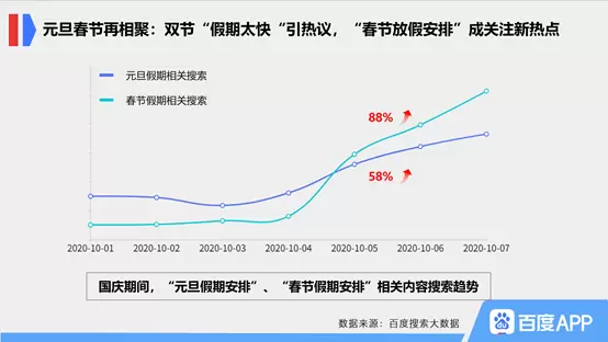 百度搜索大数据显示,国庆期间“元旦放几天“”春节假期安排“相关搜索分别上涨58%和88%,越来越多的人已经把关注点转移到下一次的假期时光。