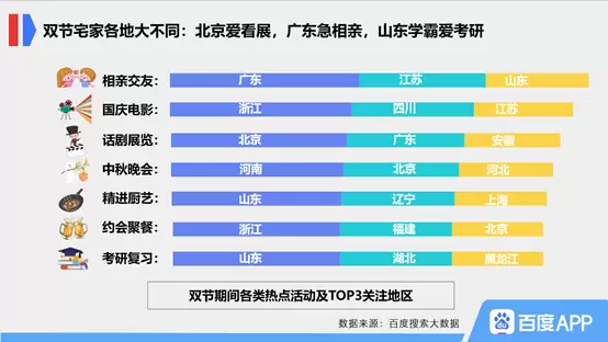 与此同时,不同地域的人们在宅家活动也多姿多彩。广东地区的网友更倾向于相亲活动,山东地区的网友则更热衷考研复习,北京人更偏爱话剧展览。
