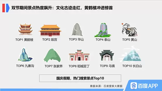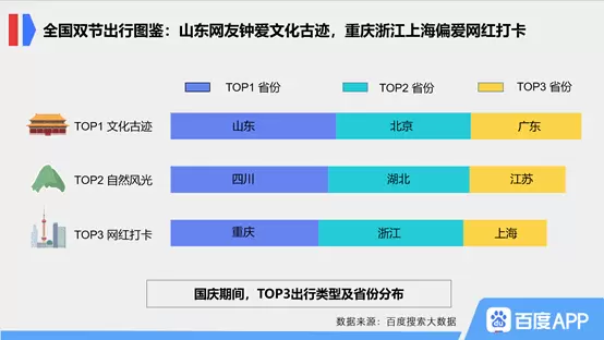 与此同时,在目的地类型的选择上,不同地域的人有着不一样的喜好。百度搜索大数据显示,山东人更喜欢搜索文化古迹,而四川人则更偏爱自然风光,重庆、浙江、上海等地更爱网红打卡。