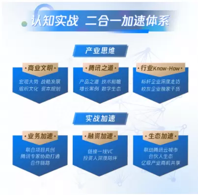 在实战加速层面:通过联合项目实践,腾讯专家亲力协助,打通合作链路帮助入选学员进行业务加速;通过“V+计划”链接一线VC,助力企业融资加速;通过联动腾讯云城市合伙人专项计划,触达亿级产业商机。