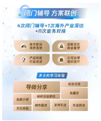 本次,腾讯AI加速器四期将通过封培辅导、方案联创方式开展学员的课程设计。入选学员将获得4次闭门辅导+1次海外产业深访+N次业务对接机会,并通过技术驱动、场景落地、战略定位、商业重塑、行业演进、公司治理等多元定制课程展开学习。