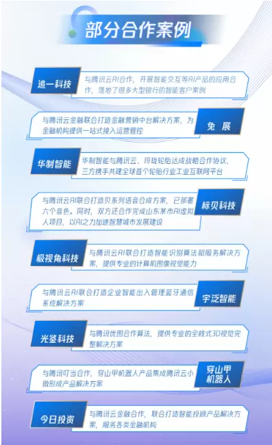 其中,追一科技与腾讯云AI合作,开展智能交互等AI产品的应用合作,落地了很多大型银行的智能客户案例;兔展与腾讯云金融联合打造金融营销中台解决方案,为金融机构提供一站式接入运营管控;华制智能与腾讯云、玲珑轮胎达成战略合作协议,三方携手共建全球首个轮胎行业工业互联网平台;标贝科技与腾讯云AI联合打造贝系列语音合成方案,已部署六个音色。同时,双方还合作完成山东某市AI虚拟人项目,以AI之力加速智慧城市发展建设;极视角科技与腾讯云AI联合打造智能识别算法和服务解决方案,提供专业的计算机图像视觉能力;宇泛智能与腾讯云AI联合打造企业智能出入管理蓝牙通信系统解决方案;光鉴科技与腾讯优图合作算法,提供专业的全栈式3D视觉完整解决方案;穿山甲机器人与腾讯叮当合作,穿山甲机器人产品集成腾讯云小微形成产品解决方案;今日投资与腾讯云金融合作,联合打造智能投顾产品解决方案,服务各类金融机构。