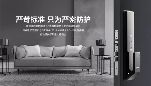 锁芯等级,是检视锁具安全性能的关键因素。三星智能锁SHP-P50采用了C级直插锁芯,配合防猫眼撬锁,符合电子防盗锁(GA374-2019)标准、中国ROHS标准,将有效保护用户及家庭的安全。