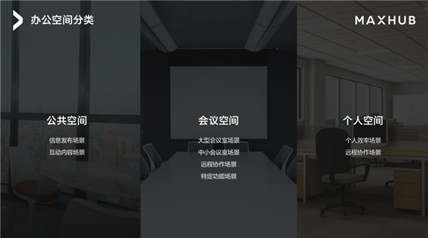 针对如何实现办公空间智慧升级的问题,MAXHUB将办公场景按空间类型进行划分,即个人空间、会议空间、公共空间三大场景。借助办公空间智慧升级,有利于推动整个园区智慧升级,效率提高。