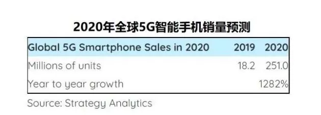 10月10日消息,StrategyAnalytics最新发布的研究报告指出,到2020年,全球5G智能手机销量将激增1300%,达到创纪录的2.5亿部。苹果iPhone,华为和三星今年正在推动5G智能手机市场的增长。