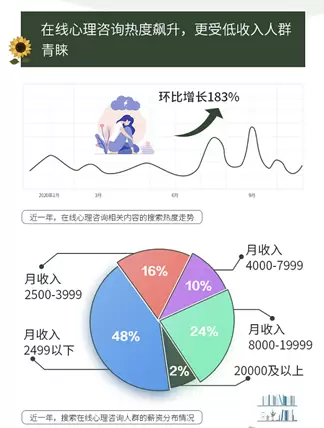 另一方面,网民也积极利用“云”产业发展带来的医疗资源。百度搜索大数据显示,近一年,“在线心理咨询”相关内容搜索热度上涨183%。心理咨询的线上化发展也惠及了不少下沉市场人群,为其提供了自我心理救治的便捷渠道。报告显示,月收入在2499元以下的用户是最爱搜索“在线心理咨询”的群体,占比高达48%。