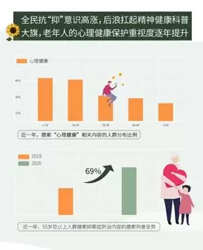 随着精神健康科普的大范围普及,重点人群的防护意识也不断提升。报告指出,90后、00后成为最关注“心理健康”的群体。抑郁高发的老年人,也在通过互联网积极寻求心理健康防护,克服退休、丧偶、空巢等带来的心理困境。数据显示,55岁及以上用户对抑郁症防治相关内容的搜索热度同比增长69%。
