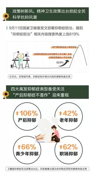 政策的出台带动了全民精神健康保护意识的高涨,百度搜索大数据显示,方案发布后,抑郁症科普、抑郁症防治相关内容搜索热度直线上升,涨幅高达819%。“产后抑郁”关注度飙升,搜索热度环比上涨106%。