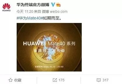 在苹果官方宣布新品发布会之后,紧接着华为手机官方微博发布消息,华为Mate 40系列全球发布会定于欧洲中部夏令时间10月22日14点(北京时间10月22日20点)举行。