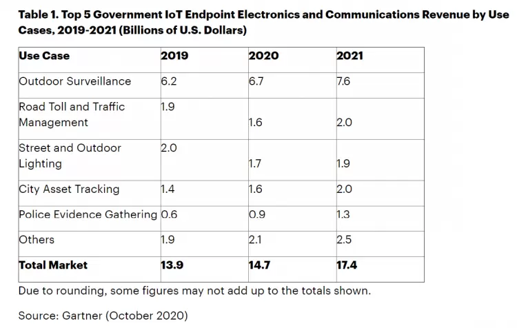 Gartner预计,到2021年,全球各国政府将在每千名城市公民中部署8台摄像头进行户外监控,高于2019年的每千人6台。