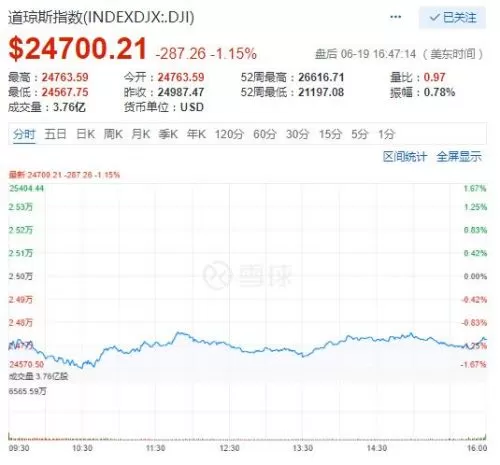 凤凰网科技讯 北京时间6月20日报道,美股周二收跌,道指抹平今年所有涨幅。美国总统特朗普发出新的威胁,使市场担心贸易争端升级、令全球股市下跌。截至收盘,道指跌287.26点,或1.15%,报24700.21点;标普500指数跌11.18点,或0.4%,报2762.57点;纳指跌21.44点,或0.28%,报7725.58点。