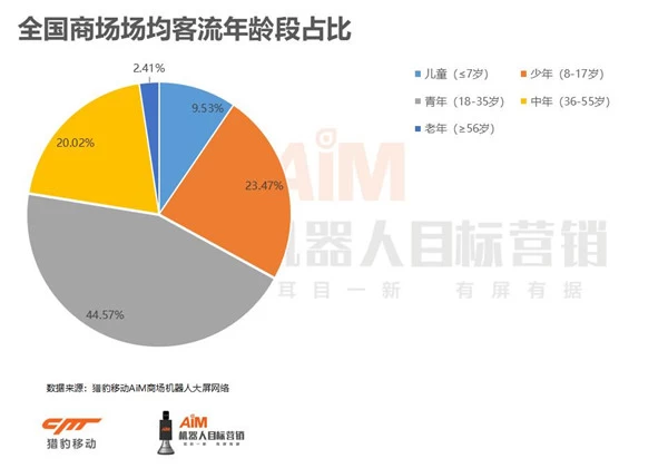 猎豹移动网红商场机器人的大数据显示,从全国商场客流年龄段分布看,基本覆盖85后、90后和95后的青年消费者(18-35岁)依旧是商场主力军,占比达44.57%。