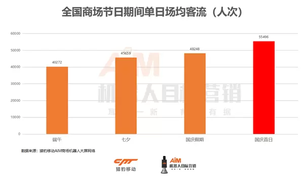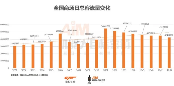 猎豹移动网红商场机器人的大数据显示,十一假期期间,全国商场日总客流迅速上升,国庆当日超5484万人次,平均超过4775万人次,较节前增长39.46%。