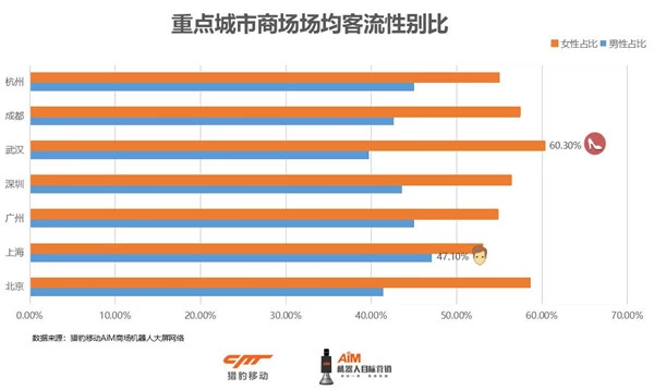 而从性别来看,全国商场场均客流中,女性占比达到56.13%。这其中武汉姑娘最给力,占比达到了60.30%!人们之前一直猜测的“报复性”消费,这个假期,真实地在武汉女性身上上演。猎豹移动在大数据背后还发现,七大城市中,爱逛街的男性出现最多的地方是上海(47.10%)。