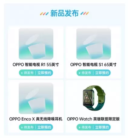 OPPO也在天猫、京东、欢太商城等电商平台上架了“OPPO互联全家桶”的预约链接,从目前预约界面上可以看到OPPO智能电视 R1、OPPO智能电视 S1、年度声学旗舰OPPO Enco X真无线降噪耳机和OPPO Watch 英雄联盟限定版等IoT新品都会在10月19日当天发布。