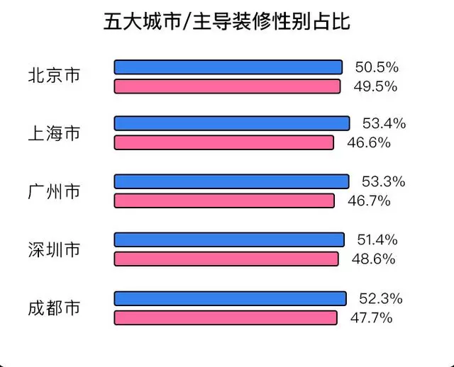 以北上广深成五城市的统计数据为例,北京的占比幅度最为微妙,男性占比略高1个百分点,而上海、广州的性别占比都接近7%,这样的比例甚至超过了成都。