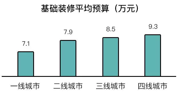 根据土巴兔大数据研究院《报告》数据,北上广深等一线城市在基础装修上,业主的平均预算只有7.1万元,二线城市接近于7.9万元,三四线城市则更高,分别为8.5万元和9.3万元。可见,这项数值与城市大小成反比。
