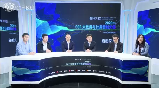 (从左至右依次为:CCF大数据专家委员会副秘书长、中国人民大学教授窦志成老师(主持人);中国科学技术大学教授、CCF大数据专家委员会副主任、CCF大数据与计算智能大赛工作委员会主席陈恩红老师;CCF理事长、CCF大数据与计算智能大赛主席、中国科学院院士梅宏院士;教育部计算机类教学指导委员会秘书长、清华大学计算机系教授武永卫老师;北京大学计算机科学技术研究所教授、CCF自然语言处理专业委员会秘书长、CCF大数据与计算智能大赛工作委员会主席万小军老师;百度集团副总裁吴甜)
