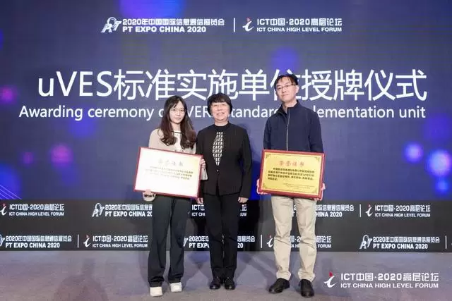 会上,中国通信标准化协会副秘书长潘峰为中国电信天翼智慧家庭科技有限公司、中国联合网络通信有限公司研究院颁发"uVES合标企业"荣誉证书。uVES标准全称为《视频服务用户体验评估算法和参数》,由中关村现代信息消费应用产业技术联盟于2017年发布,标准从直播、点播两个维度规定了视频用户体验评估模型,分析了影响用户体验质量的关键因素,定义了评估视频用户体验质量的参数和技术方法。