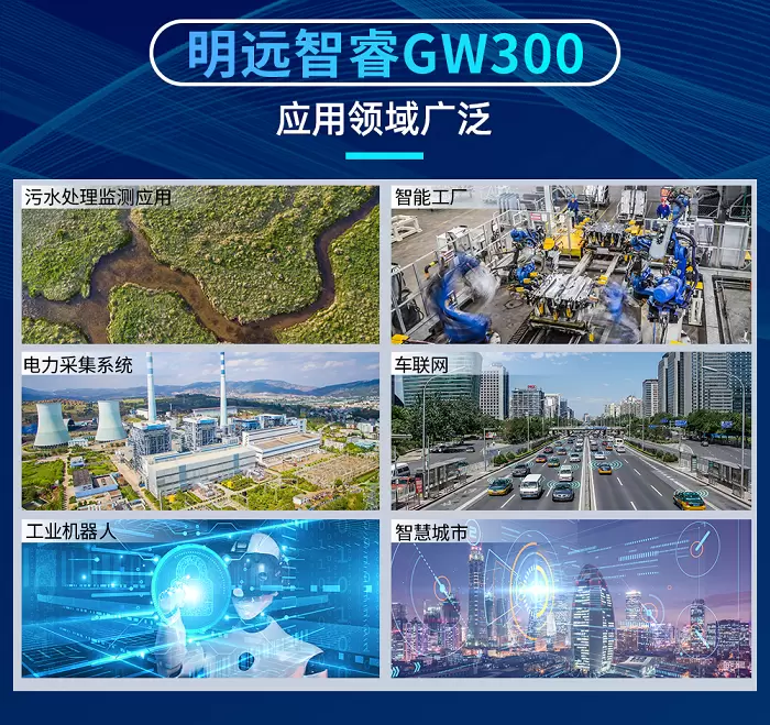 明远智睿的GW300工业网关内部集成4G全网通模块,支持4G、 LTE FDD、LTE TDD等网络制式,可实现全渠道全面覆盖,能够广泛应用于污水处理监测、电力系统、工业机器人、智能充电桩远程监测、车联网、智慧城市、智慧工厂等工业领域,为信息系统及时提供真实有效的数据。