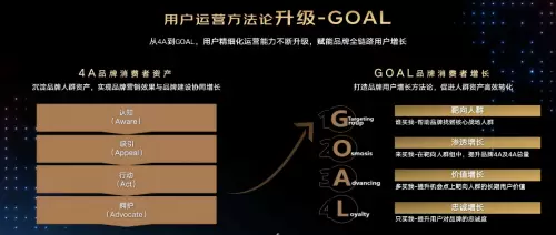颜伟鹏介绍,从4A消费者资产管理体系沉淀用户资产到全新的JD GOAL,代表着京东营销360用户精细化运营能力的不断升级。JD GOAL模型整体分为4大链路环节,即Targeting Group靶向人群,Osmosis渗透增长,Advancing价值增长,Loyalty忠诚增长。