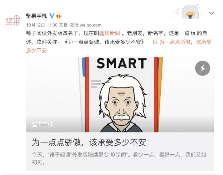 近日,坚果手机官方微博正式宣布“锤子阅读”外发版将陆续更名为“珍新闻”。更名后的珍新闻依然秉持 “看少一点,看好一点”的主张,为用户带来更好的资讯阅读体验。