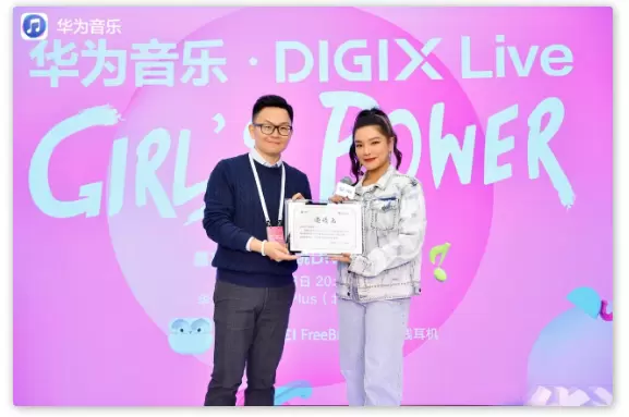 在华为音乐·DIGIX Live现场,华为音乐代表为江映蓉颁发了“华为音乐·音乐分享人”证书,希望江映蓉能将乐活的音乐态度、健康的生活理念传递给更多人,也期待更多音乐人带着优秀的音乐作品来到华为音乐·DIGIX Live现场。
