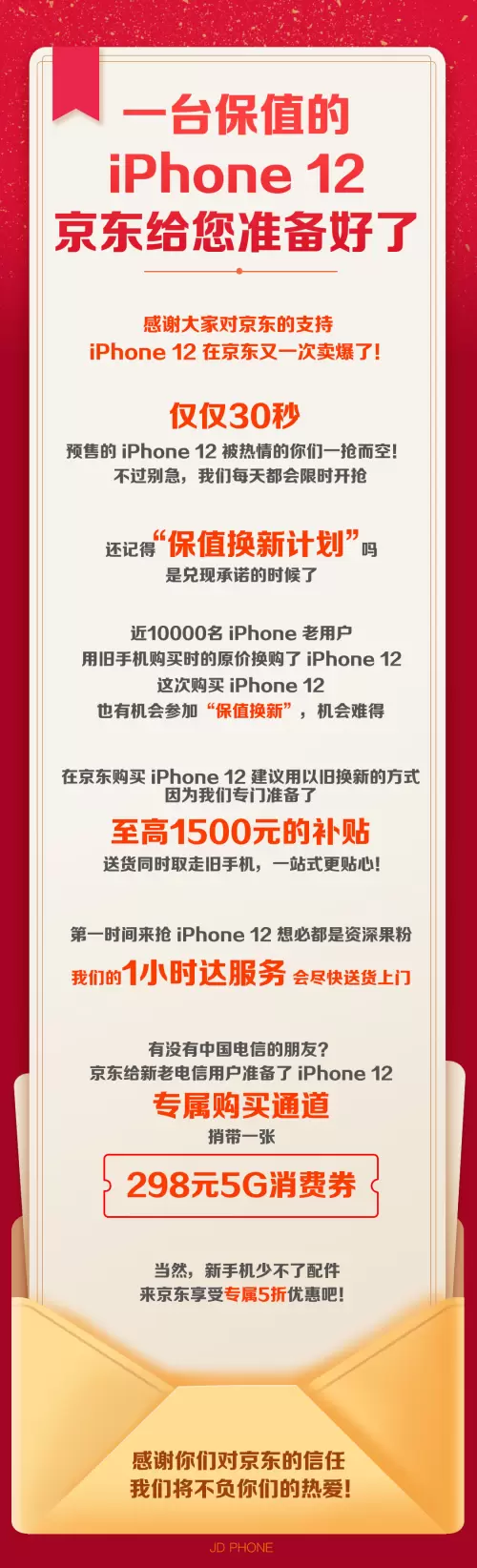 有业内权威人士表示,京东能实现30秒即告售罄与其服务政策有着直接关系。据了解,针对iPhone 12预售,京东手机推出6大品质服务,包括保值换新计划、一站式以旧换新、1小时达、三大运营商专属12大权益、换修无忧、配件5折抢等等。