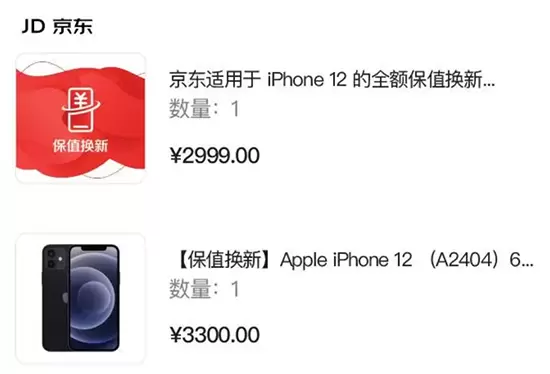 2、“保值换新“履约:履约期间,持有保值换新iPhone(订单中含有”保值换新“商品且无退货)的用户,可将订单中iPhone按照订单中显示金额,保值折抵换购下一代iPhone新品。保值换新权益价格不作为未来折抵价格。如下图中,未来换购下一代iPhone时,此iPhone 12可折抵3300元。